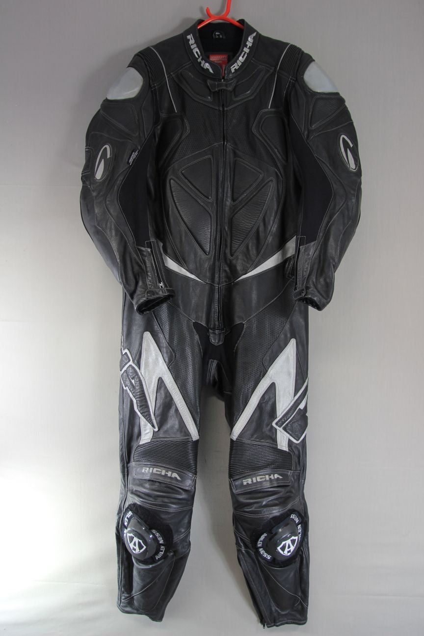RICHA 1PIECE BLACK & SILVER LEATHER BIKER SUIT + CE ARMOUR & KNEE SLIDERS 46-48"