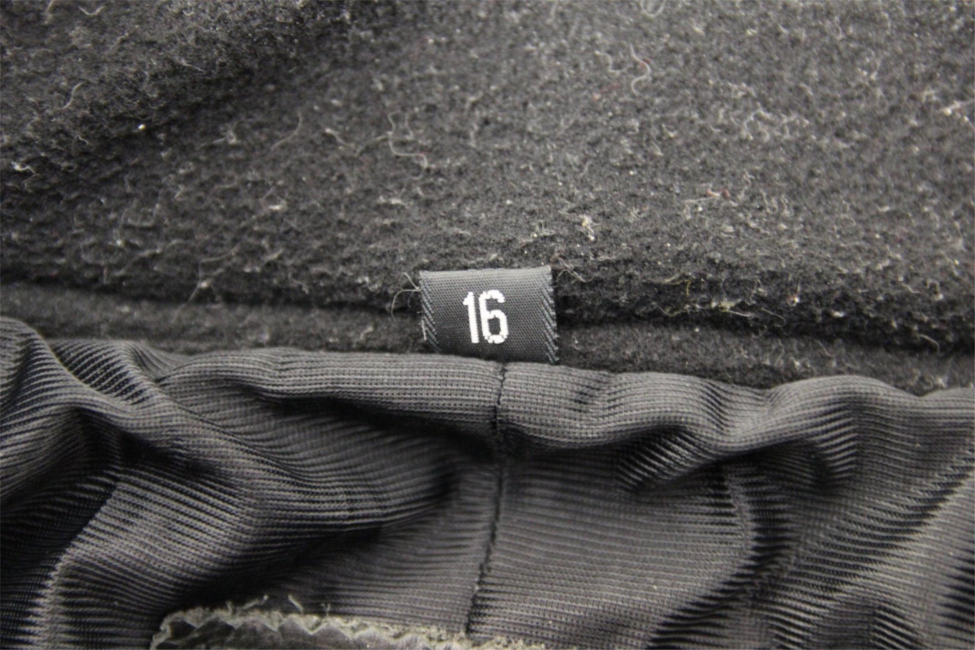 Fastened by a zip, with stud fastener and metal clasp at the waist, an adjustable velcro strap with buckle at the front of the waist and zips at the bottom of the legs.