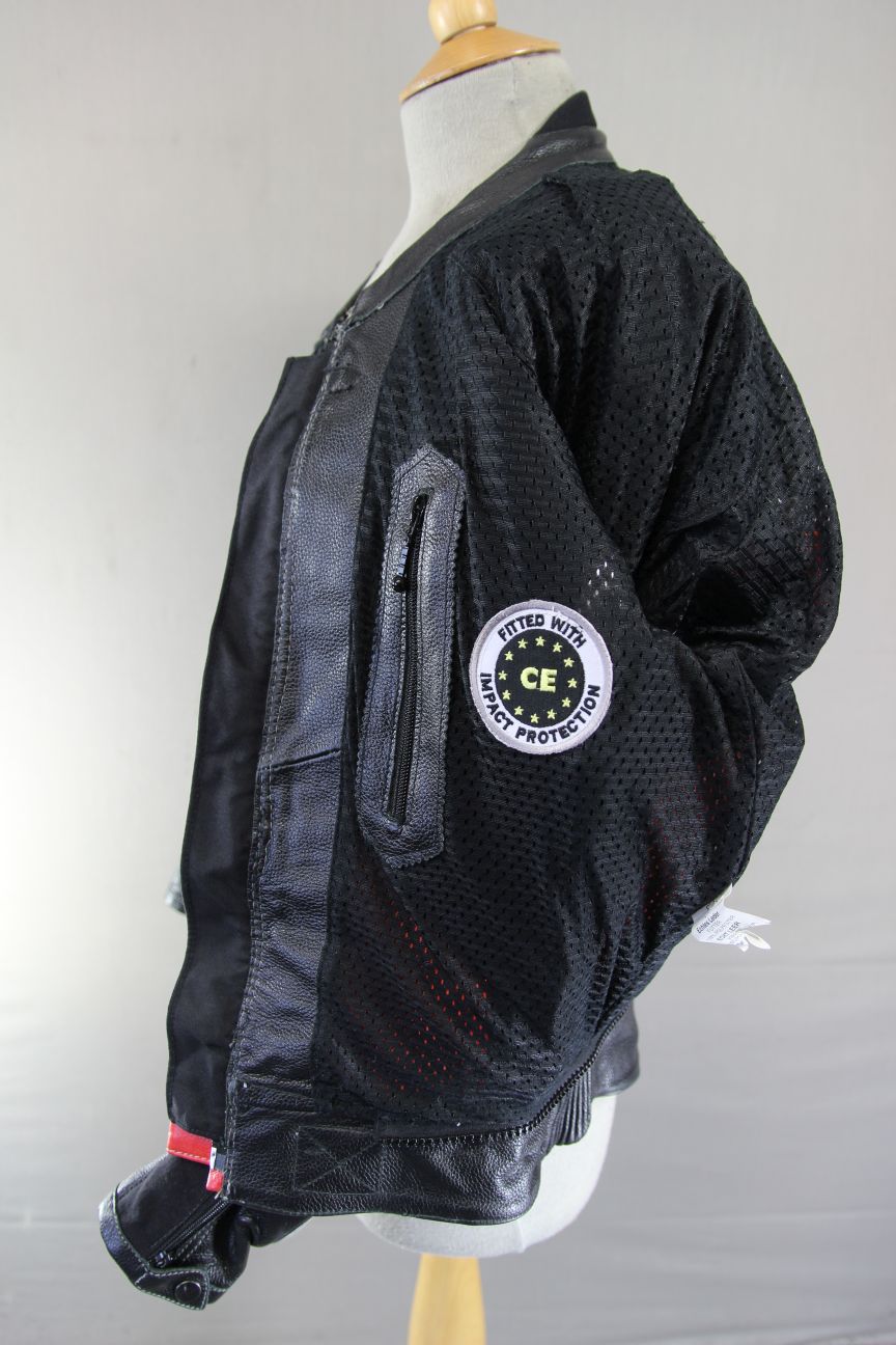 RICHA BLACK, RED & SILVER LEATHER BIKER JACKET WITH REMOVABLE CE ARMOUR: SIZE 12