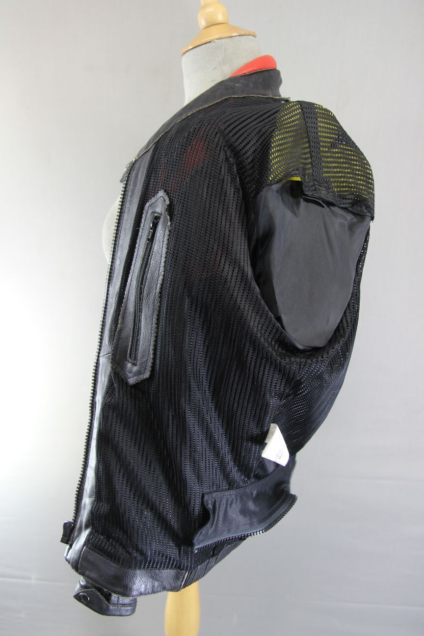 Black, red & silver leather, with Scotchlite 3M reflective trim. The jacket is partly made from breathable black kevlar (on the underside of the sleeves). The jacket has a breathable black lining.