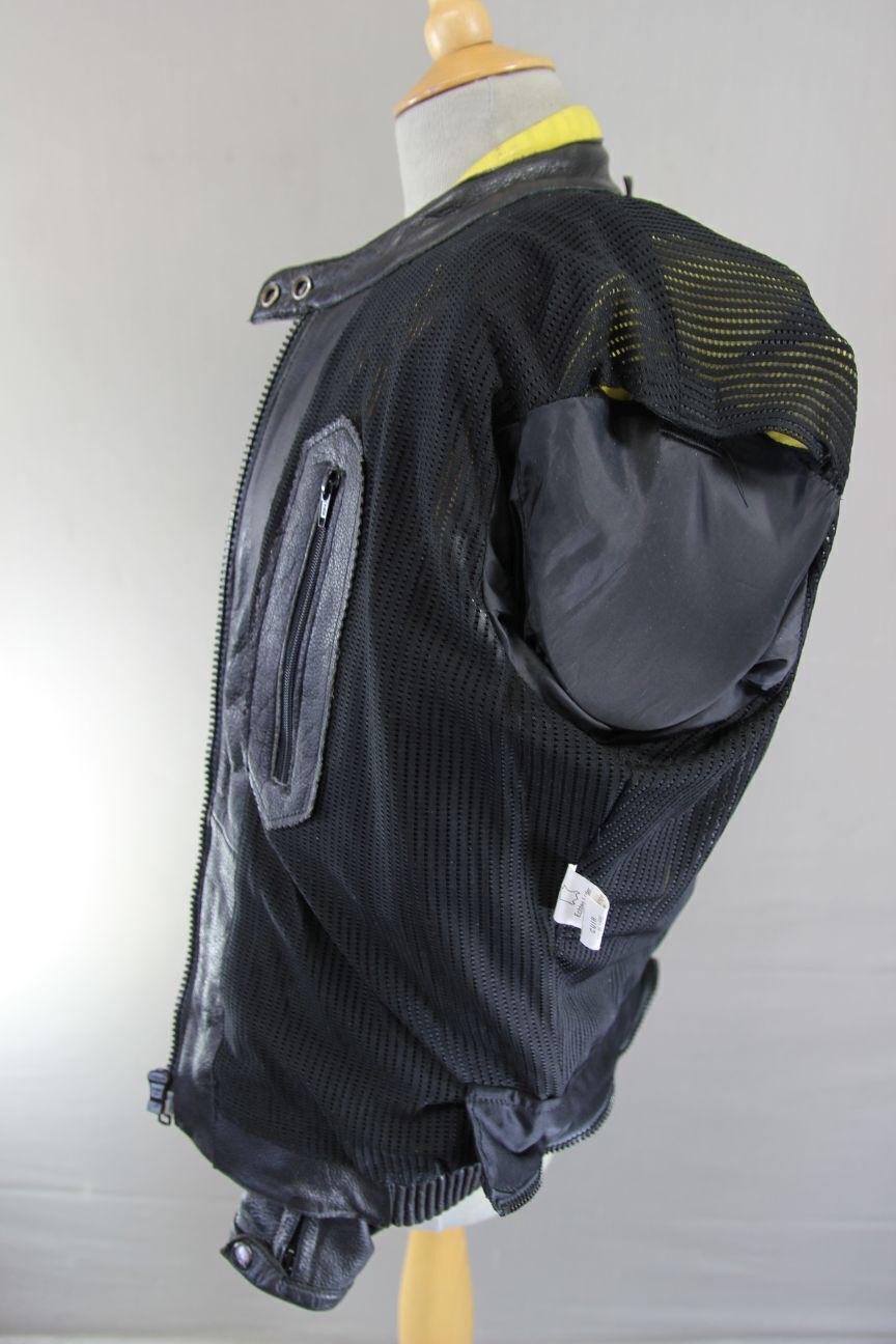 Black, yellow & silver leather, with Scotchlite 3M reflective trim. The jacket is partly made from breathable black kevlar (on the underside of the sleeves). The jacket has a breathable black lining.