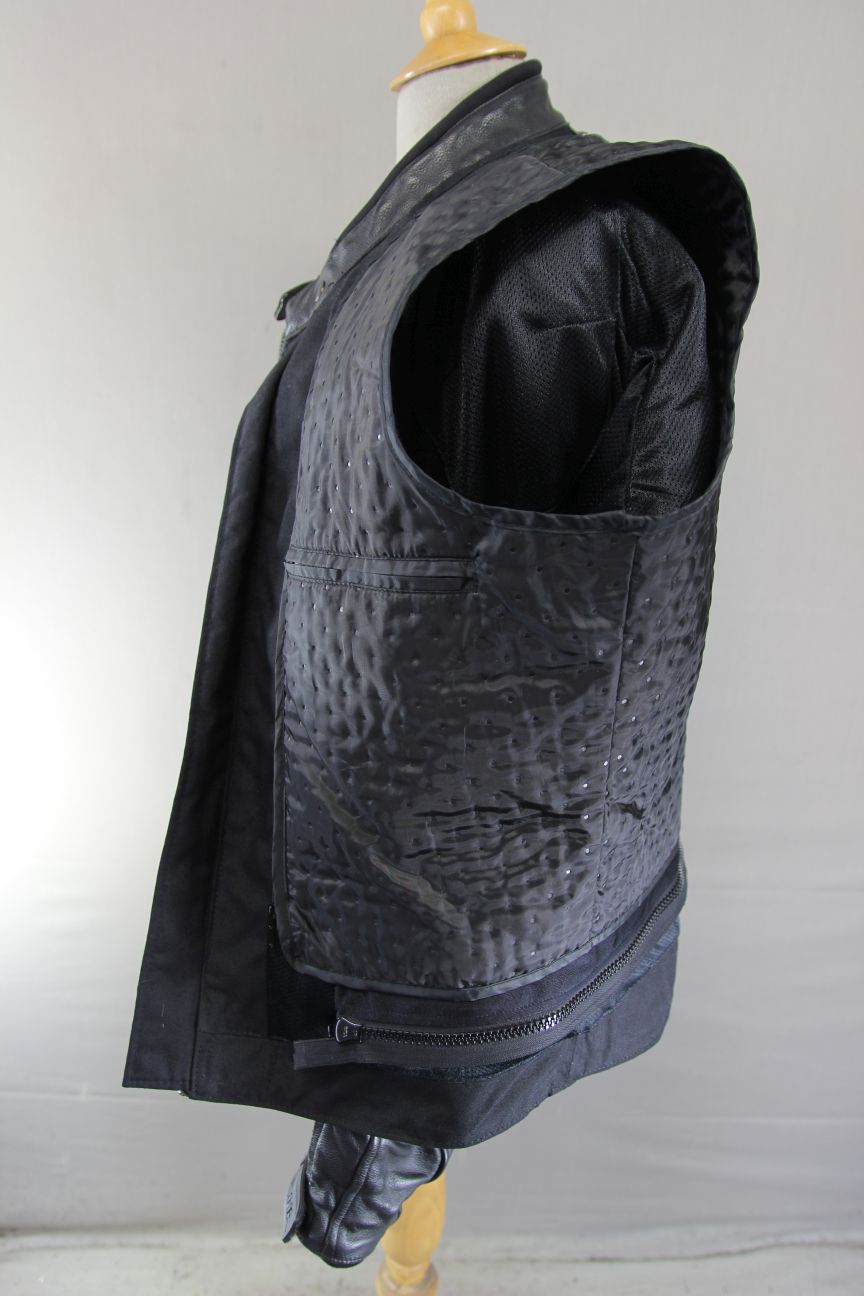 The sleeves are part made from a breathable black textile material (label says 95% cow leather/5% polyamide).