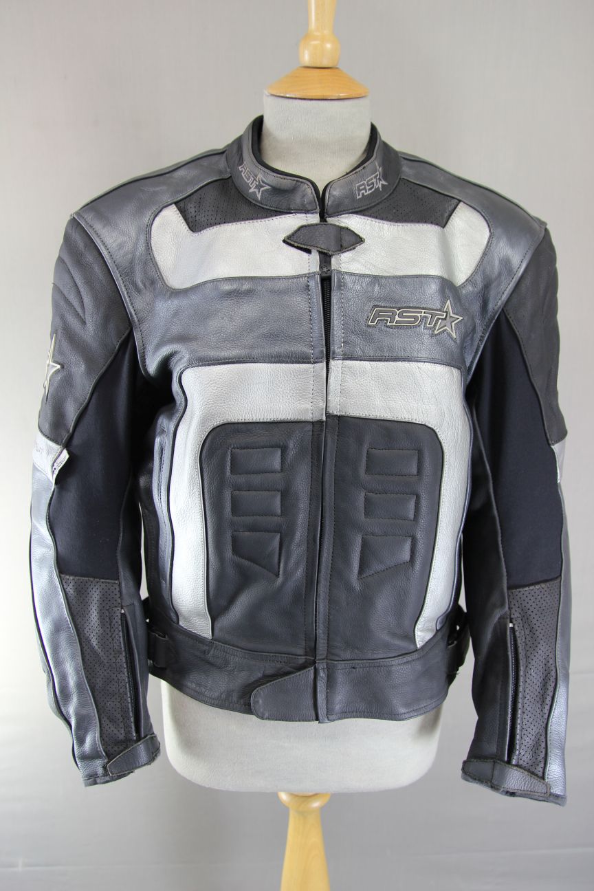 RST BLACK, SILVER & WHITE LEATHER BIKER JACKET + SHOULDER/ELBOW ARMOUR: SIZE 16