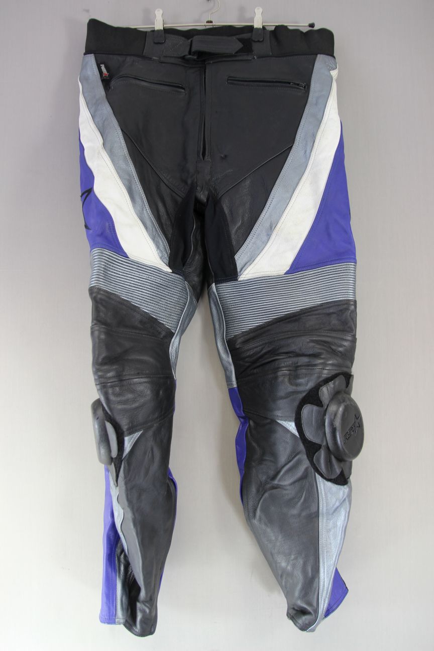 RST BLACK, BLUE, SILVER & WHITE COWHIDE LEATHER BIKER TROUSERS WITH REMOVABLE KNEE & SHIN CE ARMOUR & KNEE SLIDERS