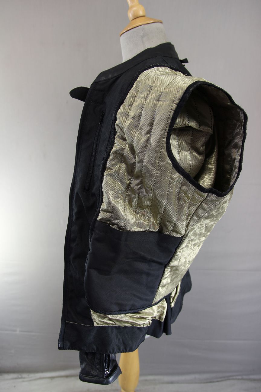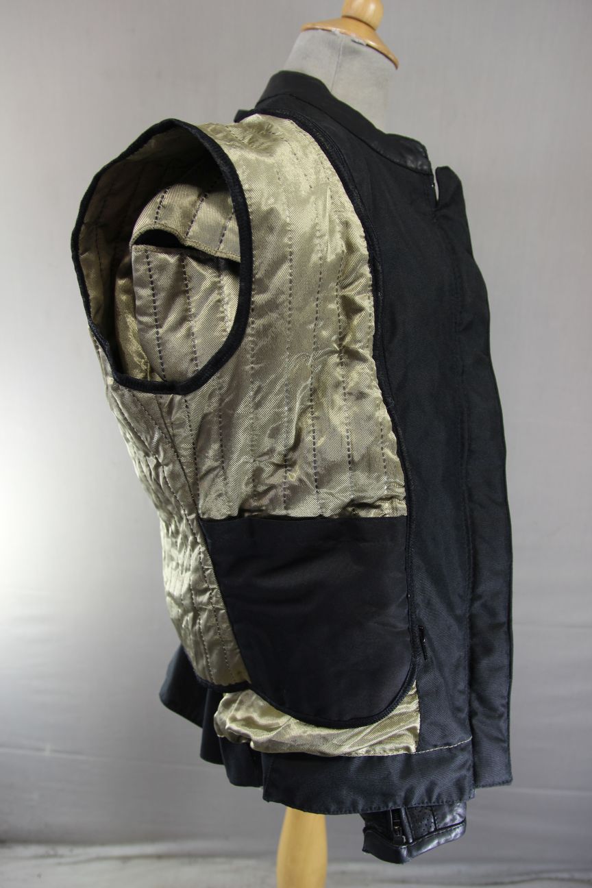 Black leather, with a perforated band around the chest and down the sleeves (for ventilation). The jacket is partly made from a breathable black kevlar type textile material (at the sides). The jacket has a smooth gold coloured lining and comes with a matching zip in additional lining.
