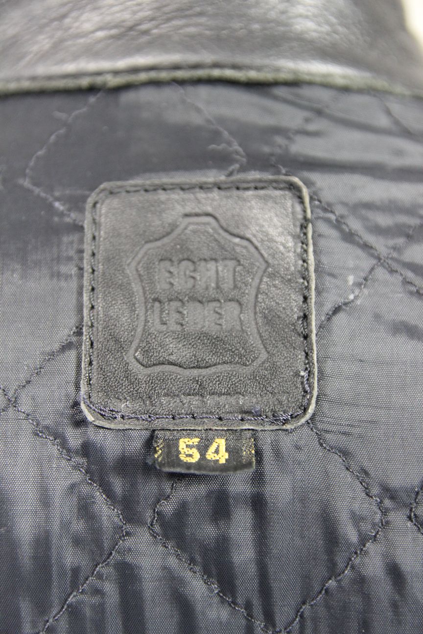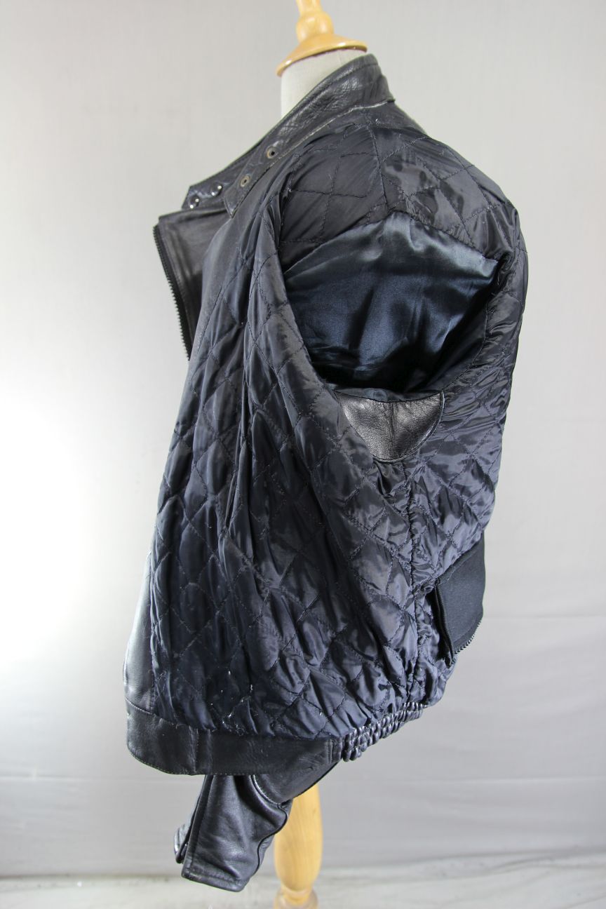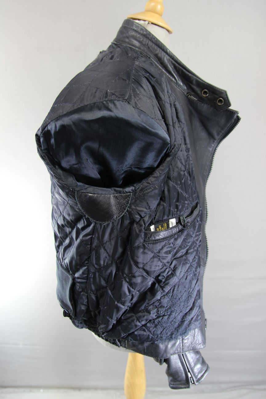 The jacket has a quilted black polyamide lining. There are leather panels on the lining under the arms.