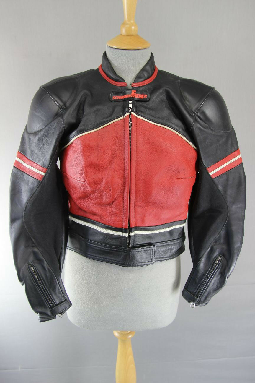 The jacket is black, red and white, with reflective trim at the back of the waist. The Schwabenleder brand name is displayed on the velcro strap at the top of the zip and at the back of the shoulders.