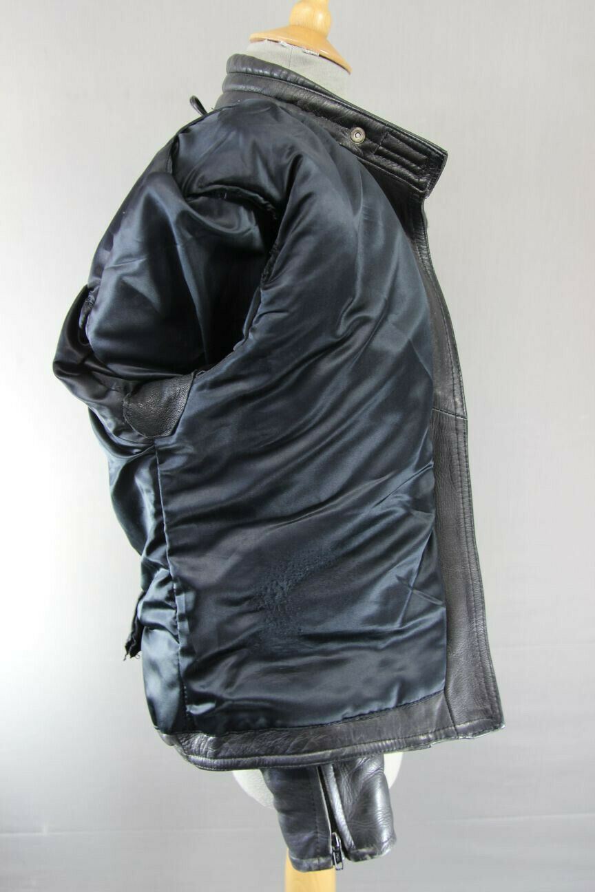 The jacket has a smooth black lining. There are leather panels on the lining under the arms.