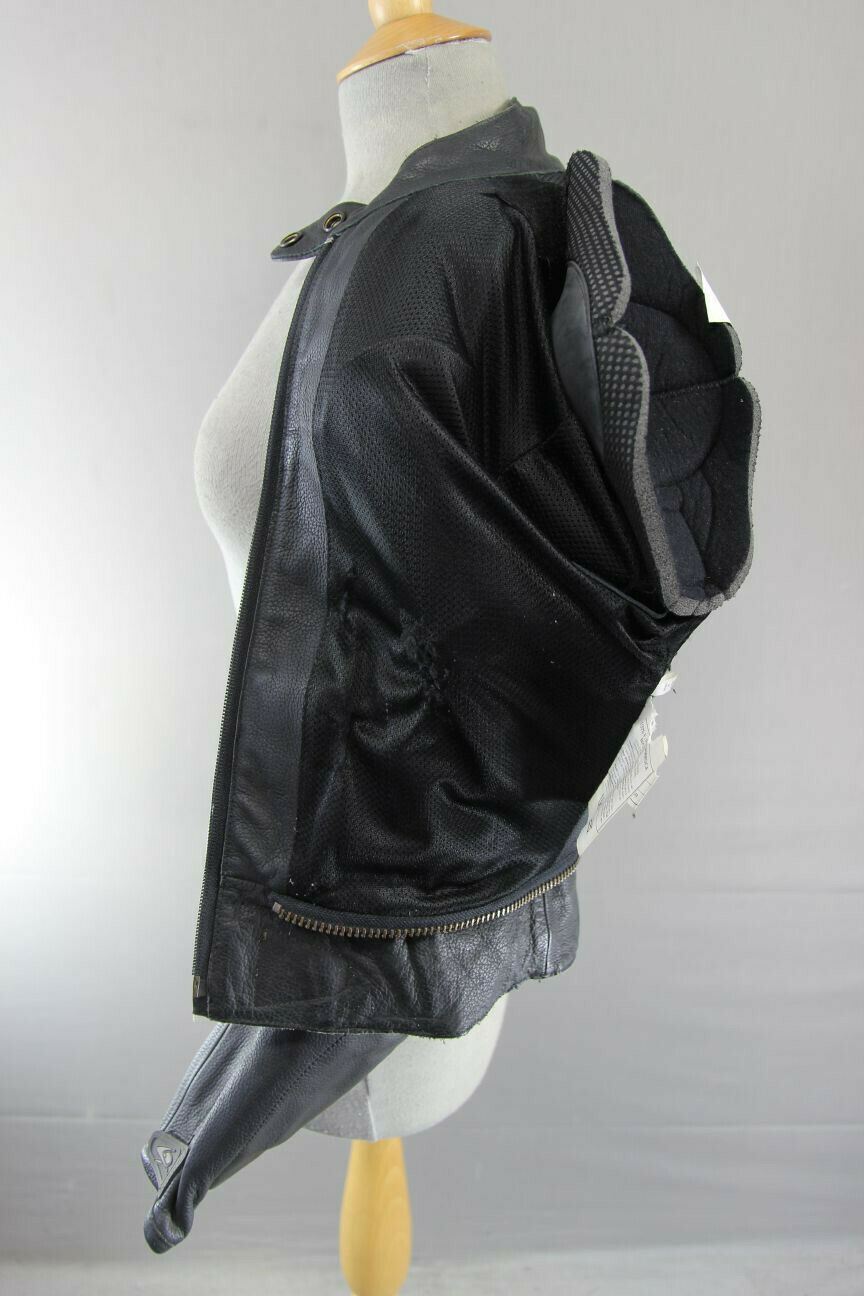 The jacket has a breathable black nylon lining with leather panels under the arms. There is a small tear to the lining below the right sleeve.