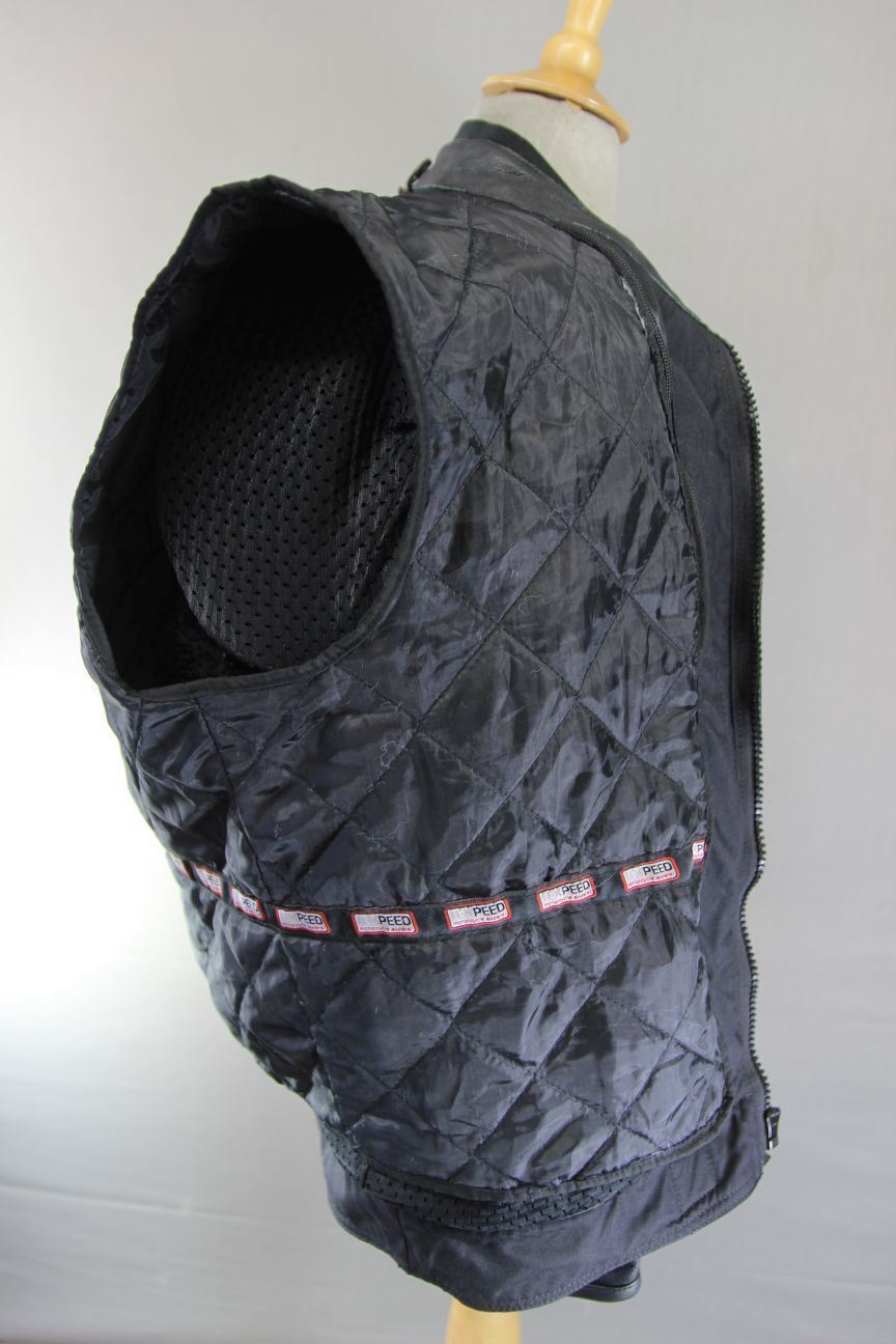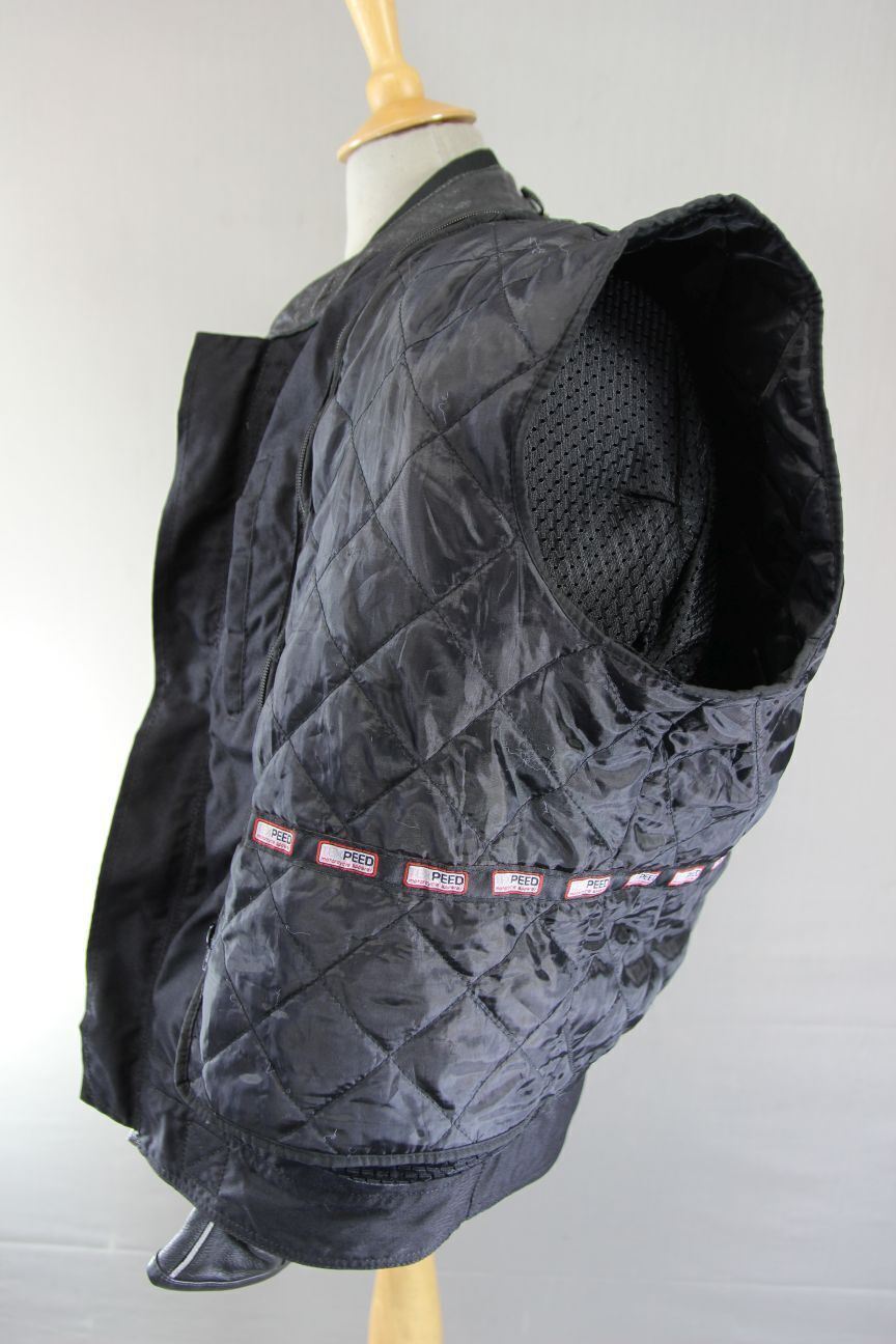 Fitted with removable CE armour at the back, shoulders and elbows, all held in velcro fastened 'pockets' on the lining. There are padded panels built into the front of the jacket and the shoulders.