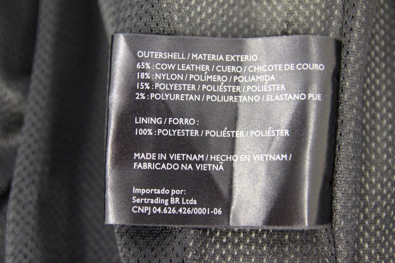 Made from black leather, with reflective trim and breathable black textile inserts (label says 65% cow leather/18% nylon/15% polyester/2% polyurethane).