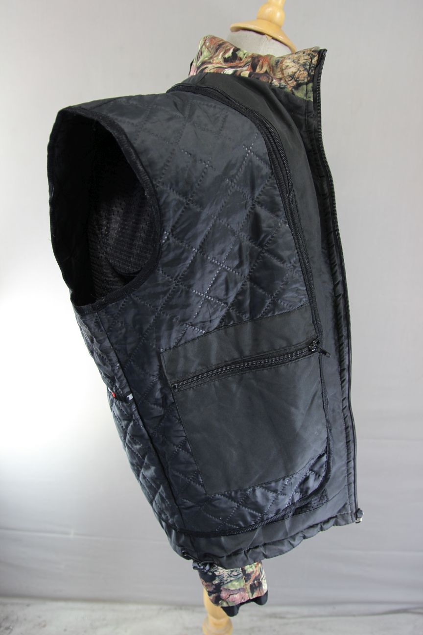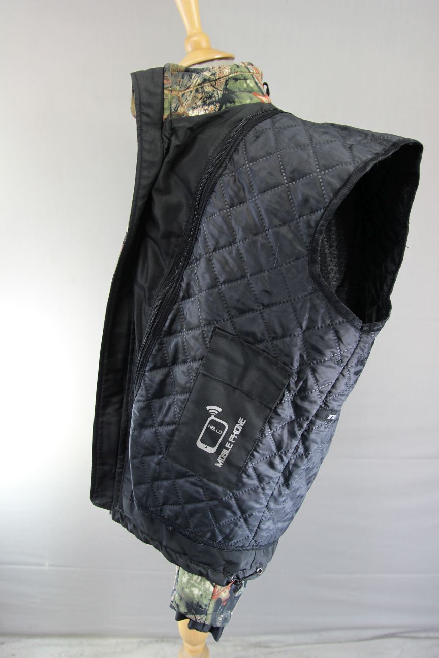 3 x zipped pockets at the front - 2 slanted pockets at the waist and a vertical pocket on the chest on the left - plus a another zipped pocket on the jacket lining and another on the additional lining, as well as a mobile phone pocket with velcro fastened flap.