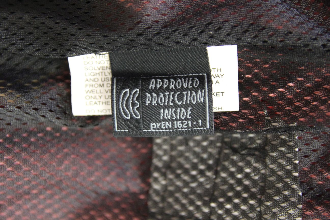 A SUPERB QUALITY LEATHER BIKER JACKET WITH FULL SET OF PROTECTORS. BLACK & RED LEATHER, WITH SILVER TRIM.