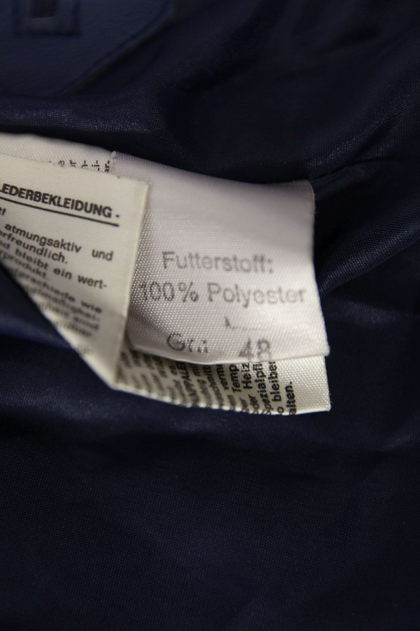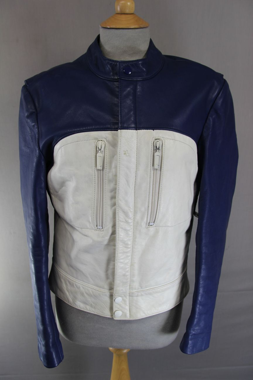 A SUPERB QUALITY LEADING BRAND BIKER JACKET IN DARK BLUE AND CREAM LEATHER. NOT SURE OF THE EXACT AGE OF THIS JACKET BUT IT SAYS MADE IN WEST GERMANY, SO MUST DATE BACK TO THE 1980'S AT LEAST. THIS JACKET MAY APPEAL TO A COLLECTOR.