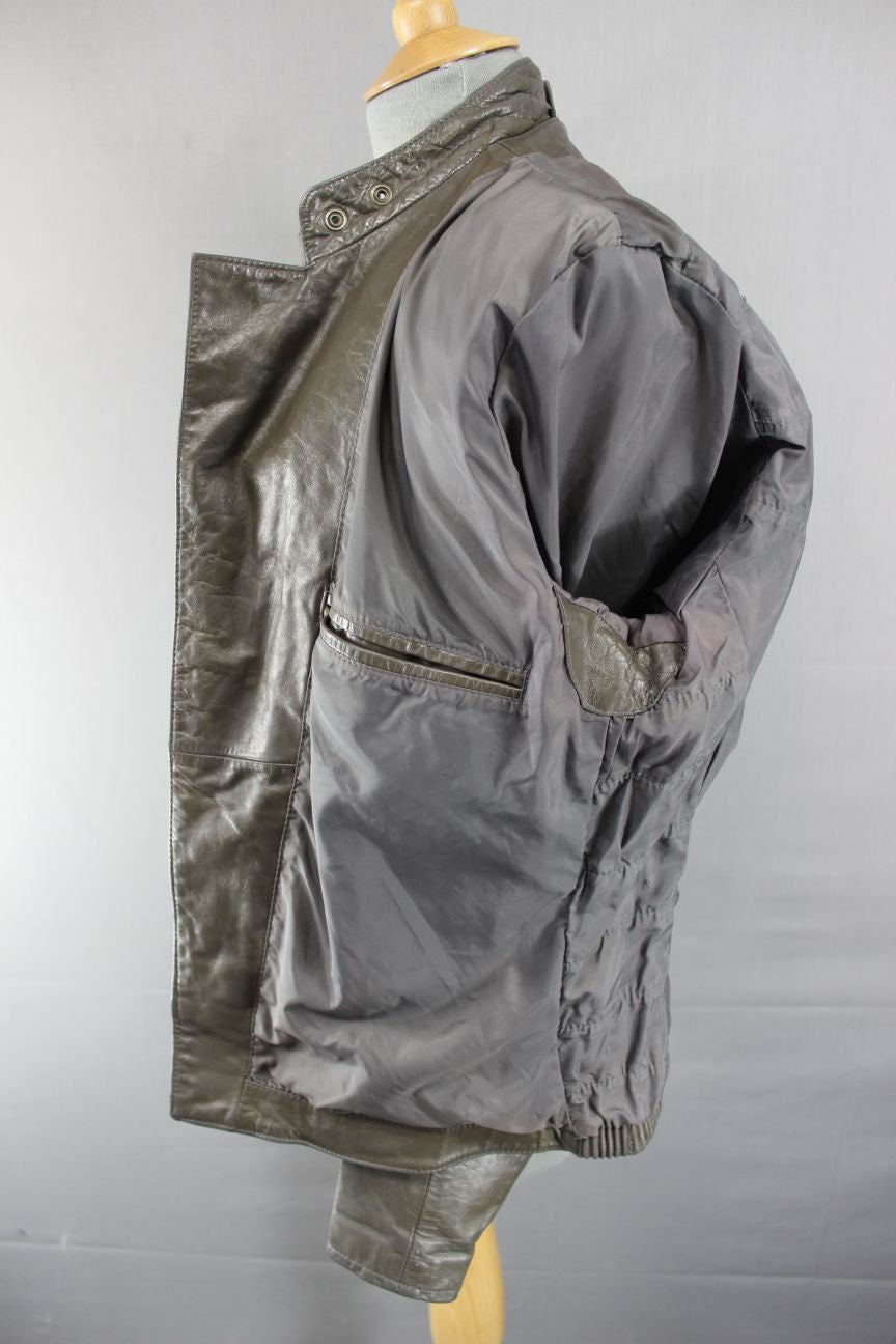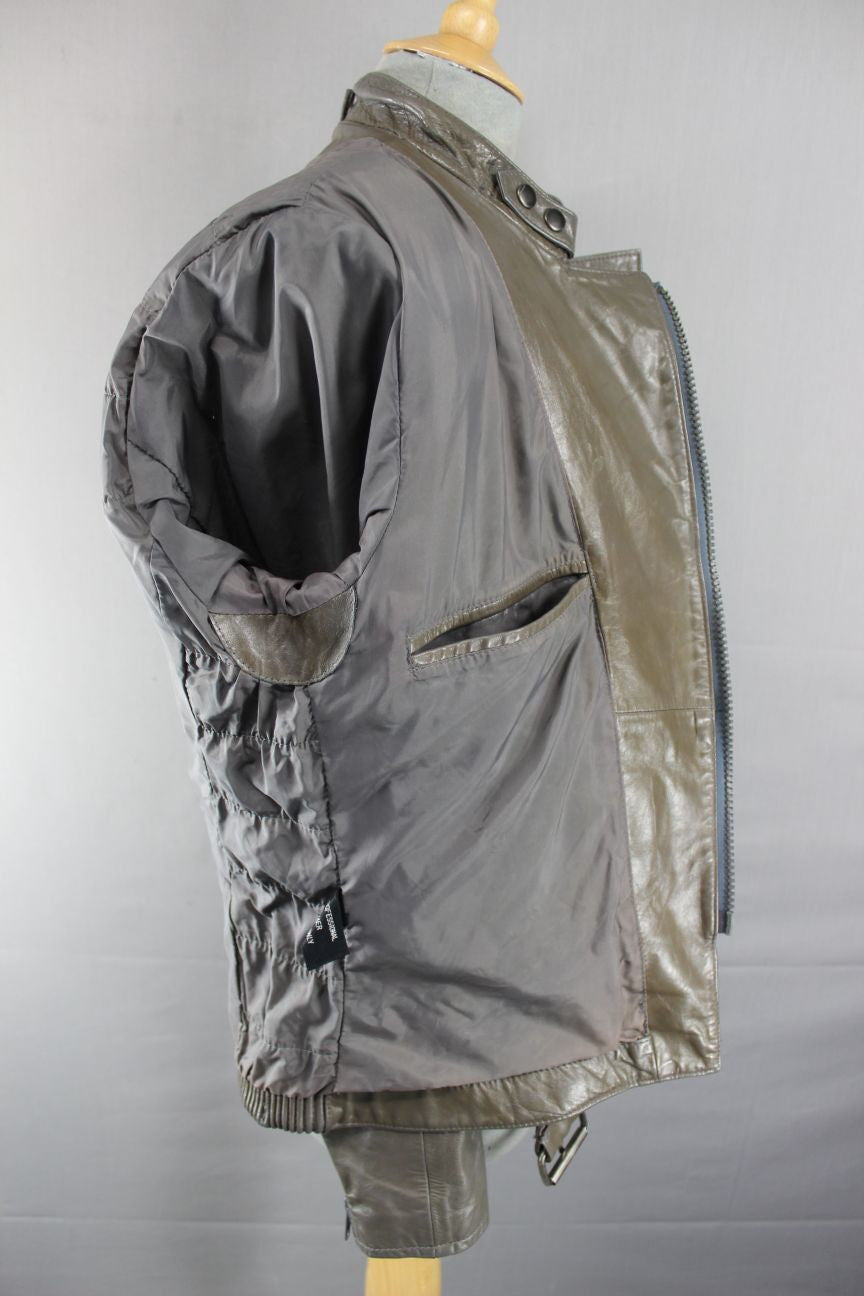 The jacket has a matching nylon taffeta lining. There are leather panels on the lining under the arms.