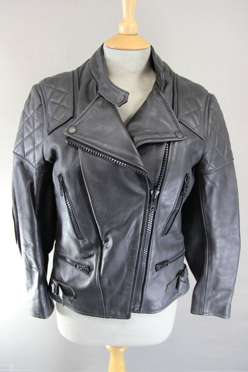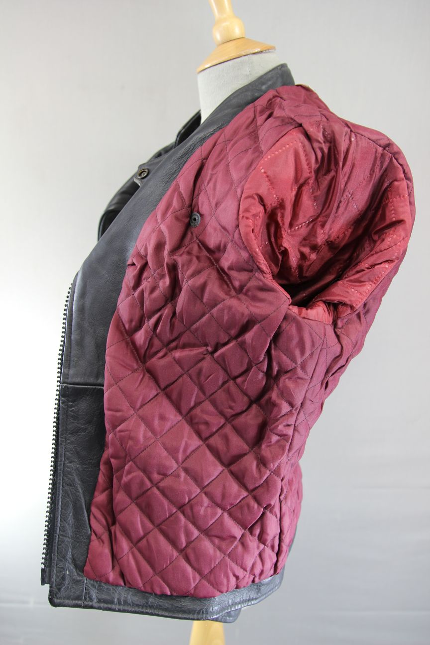 A SUPERB QUALITY BLACK LEATHER BIKER JACKET IN ICONIC VINTAGE 70's STYLE, WITH FOLD DOWN COLLARS & QUILTED PADDING.