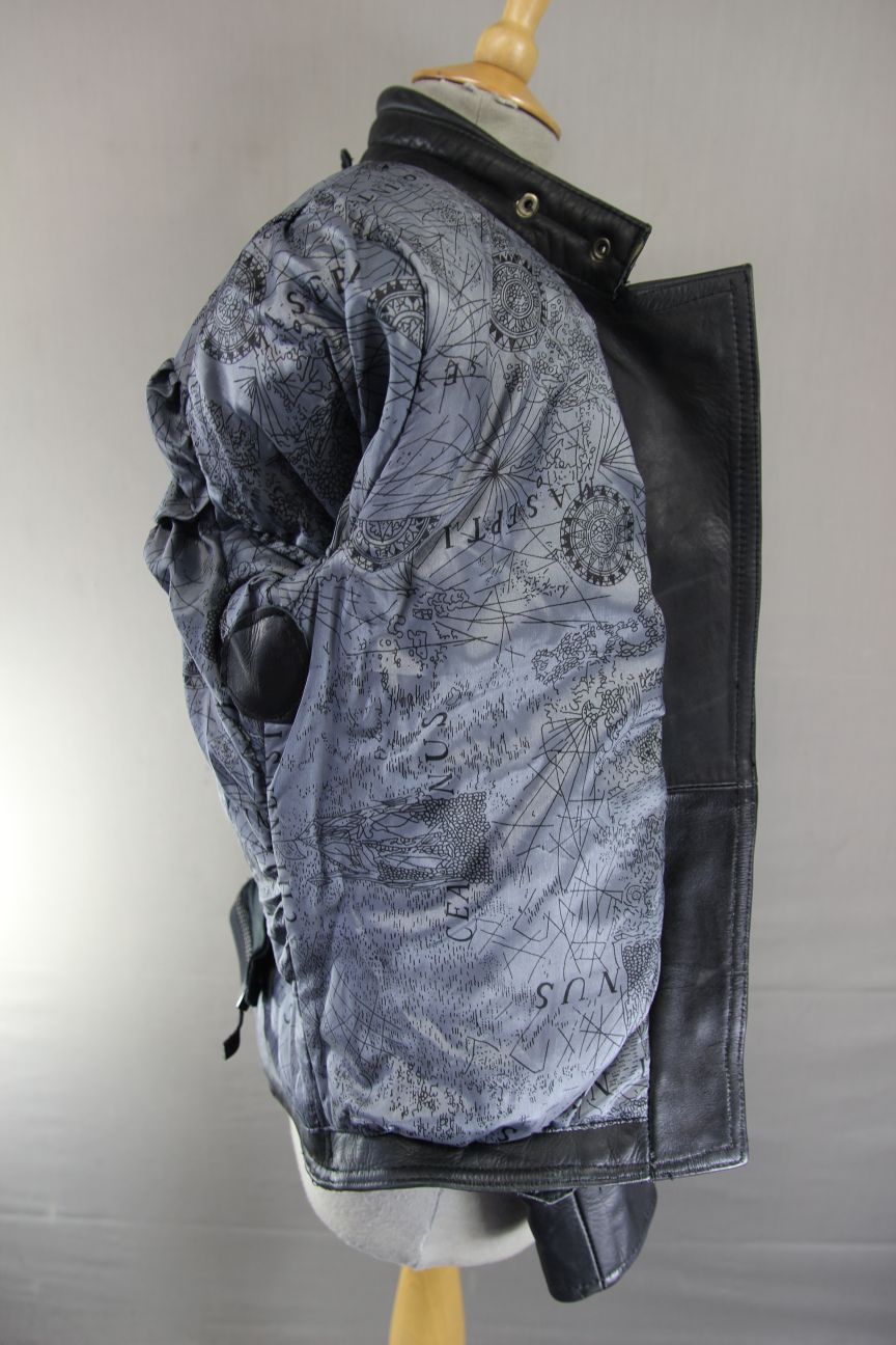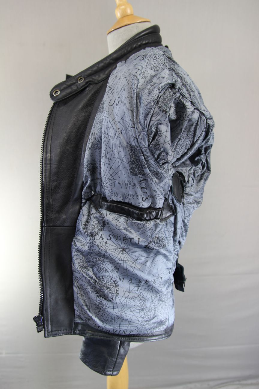 The jacket has a patterned silver coloured lining with leather panels under the arms.