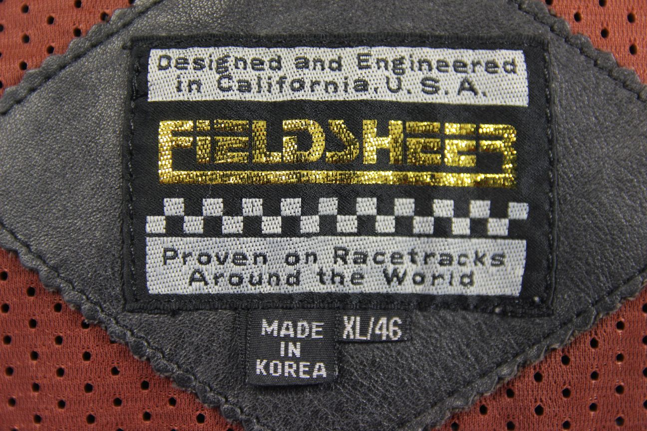 There are 3 zipped pockets at the front as well as an inside pocket with zip. There is also a zipped panel at the front of the jacket that can be opened to provide ventilation and contains holders for pens, etc, as well as another pocket, please see photos. It has a 2 way zip, so can be partially opened/closed as preferred. As you can see, there is a small stud fastened strap over the panel. The Fieldsheer brand name and 'Ride the all legendary classic' slogan are stitched into the leather above the flap.