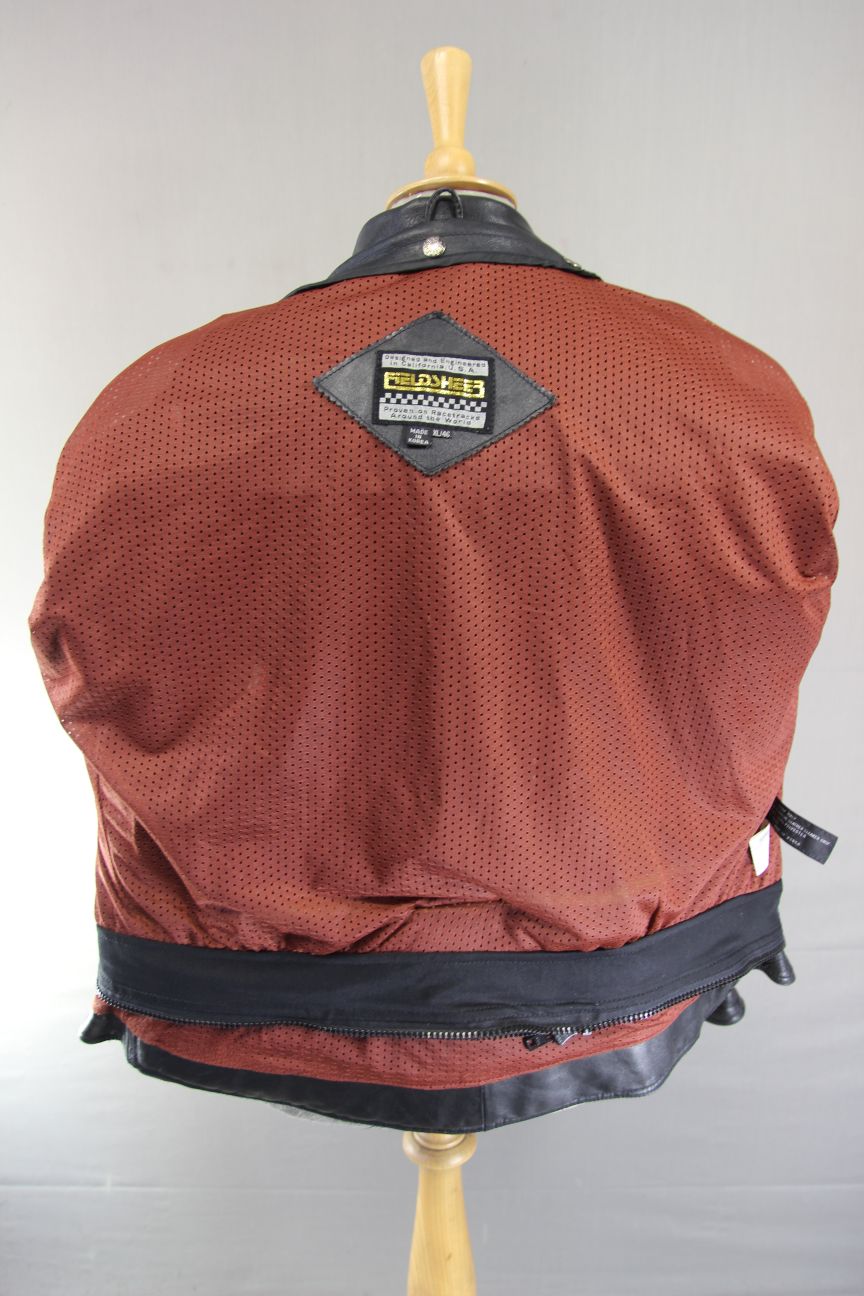 The jacket has a breathable maroon coloured lining with leather panels under the arms.