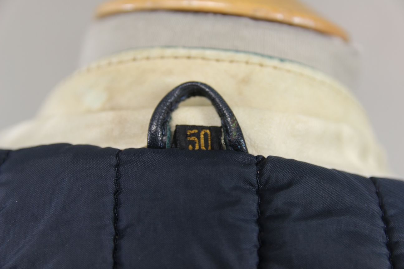 A SUPERB QUALITY LEADING BRAND VINTAGE BIKER JACKET. VERY DISTINCTIVE DESIGN, IN NAVY BLUE & CREAM COLOURED LEATHER.