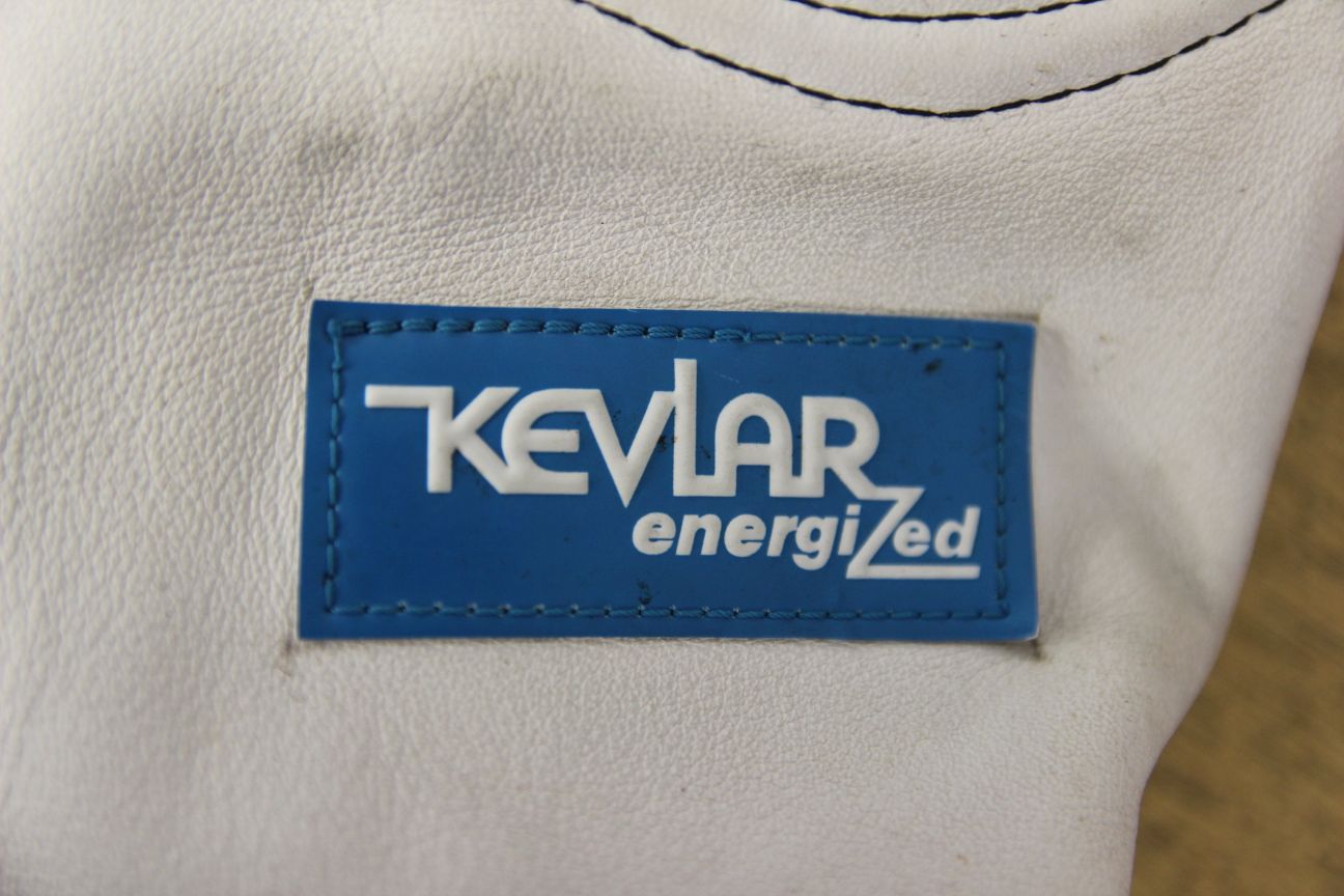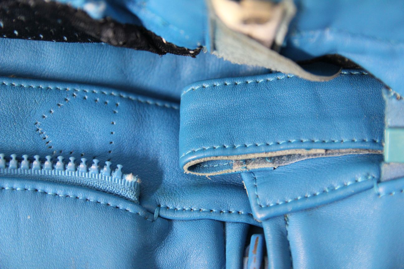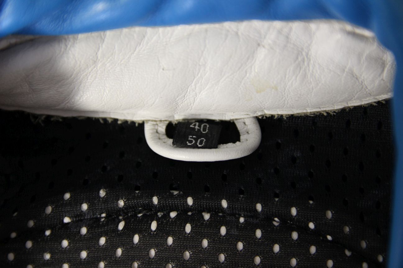 VINTAGE RIVA 2 PIECE KEVLAR REINFORCED LIGHT BLUE, DARK BLUE & WHITE LEATHER BIKER SUIT WITH REMOVABLE KNEE PROTECTORS
