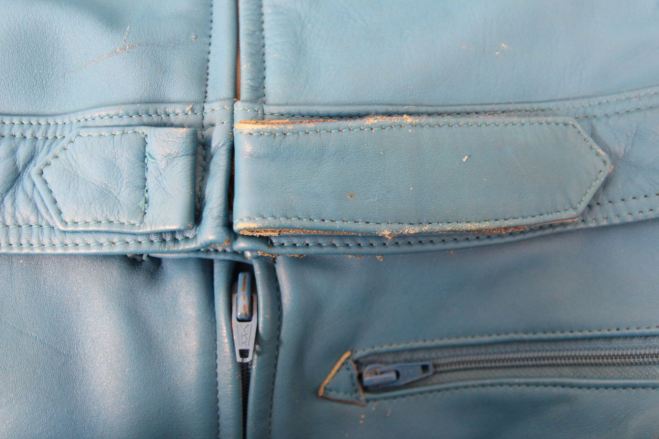 The leather is sky blue, navy blue (almost black) & white. It is perforated for ventilation under the arms, at the inside of the elbows and at the back of the knees. There is a small zipped air vent on each side at the back of the jacket.