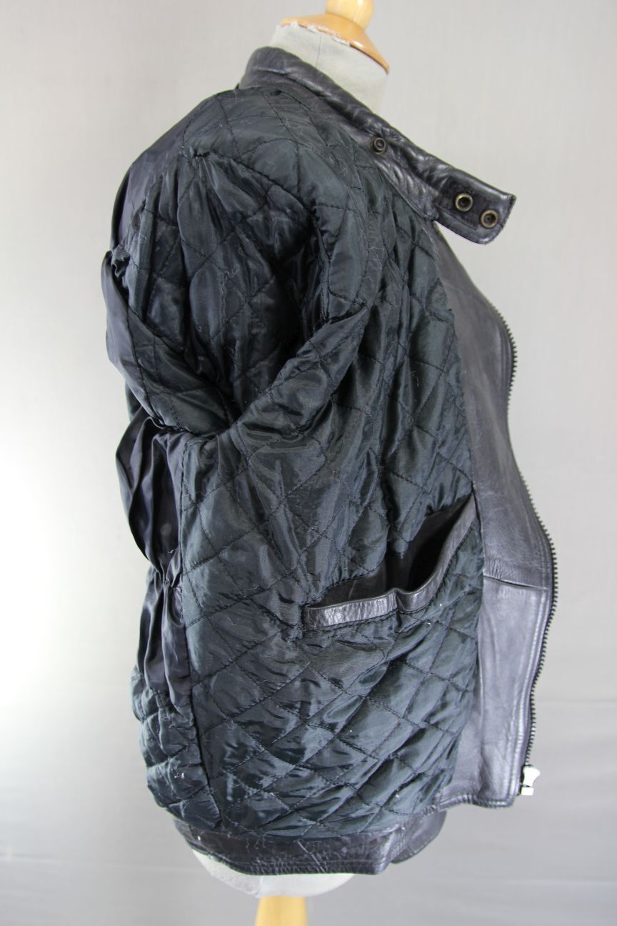 A SUPERB QUALITY VINTAGE BIKER JACKET IN BLACK LEATHER, TRIMMED WITH RED LEATHER ON THE SHOULDERS.