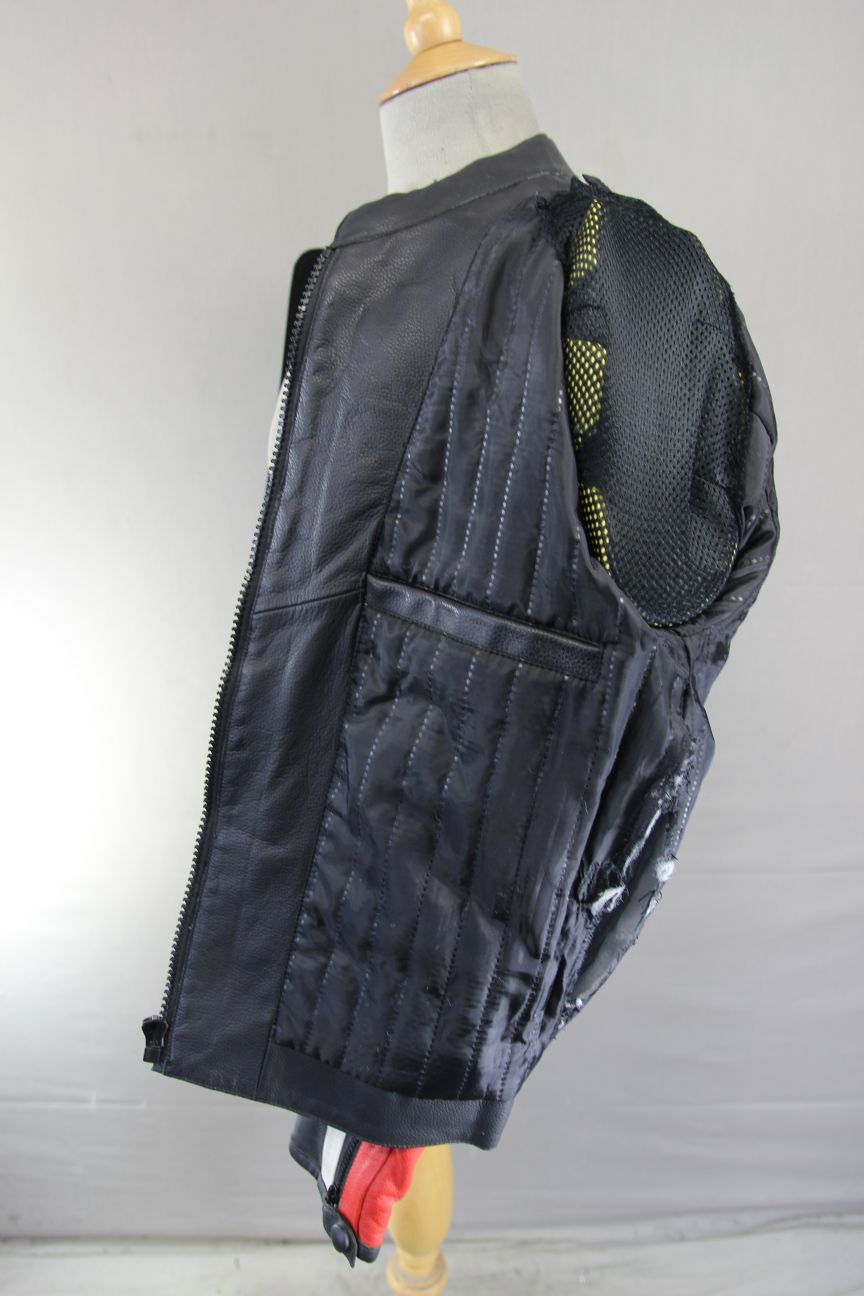 X-TREME BLACK, RED & WHITE LEATHER BIKER JACKET WITH REMOVABLE CE ARMOUR